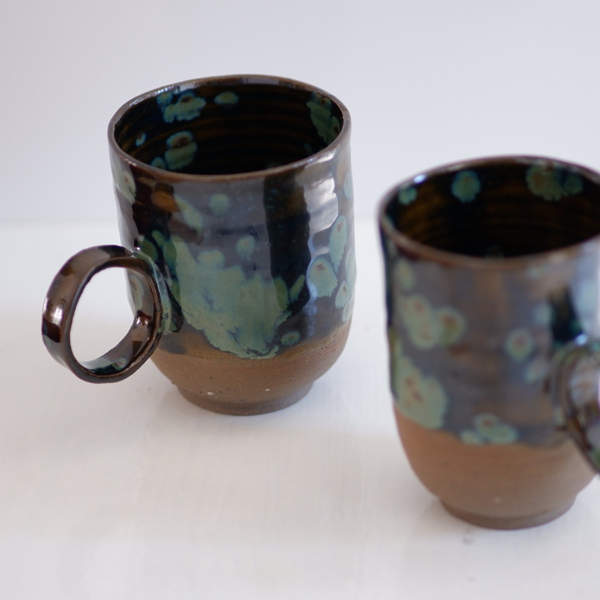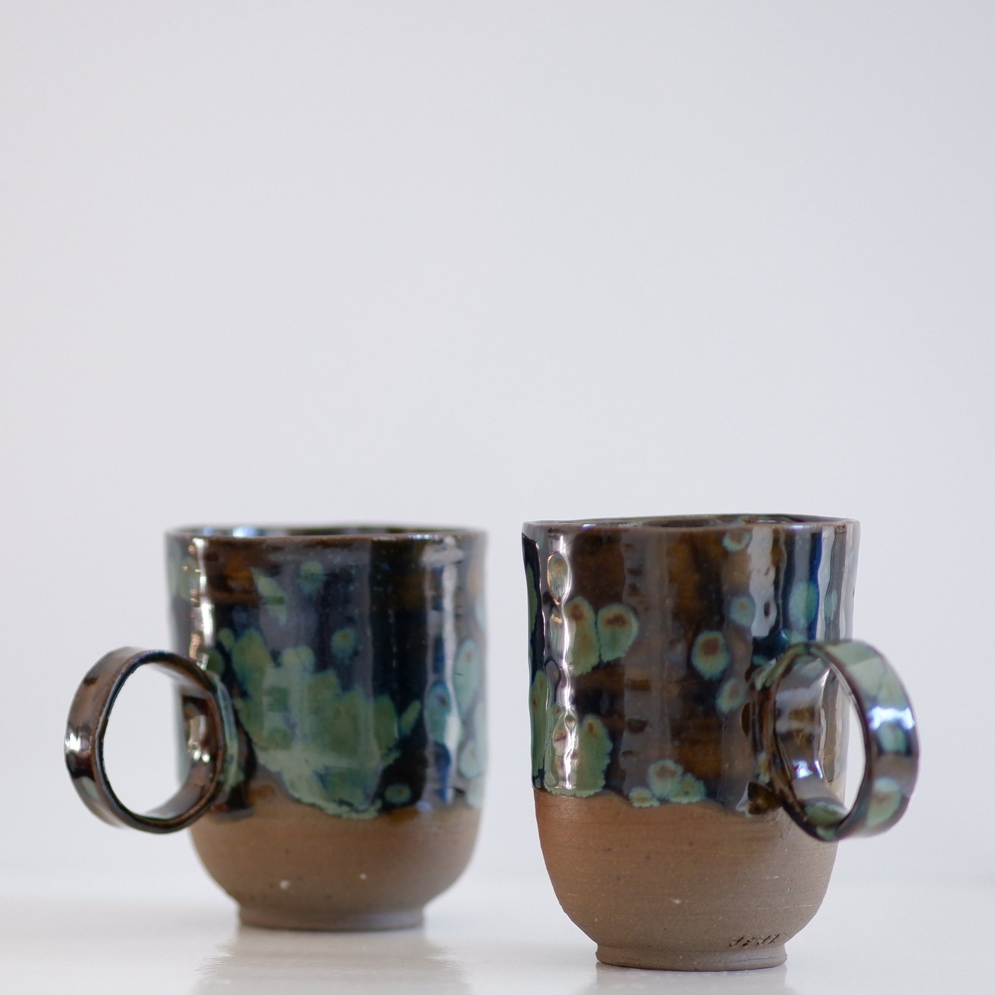 Cette tasse fabriquée à partir d'argile recyclée a une glaçure olive brillante avec des cristaux turquoise, bleu foncé et marron. Il est compatible avec les aliments et le lave-vaisselle. Ils mesurent tous les deux environ 3,75 pouces (9,5 cm) de haut et 3 pouces (7,5 cm) de large.