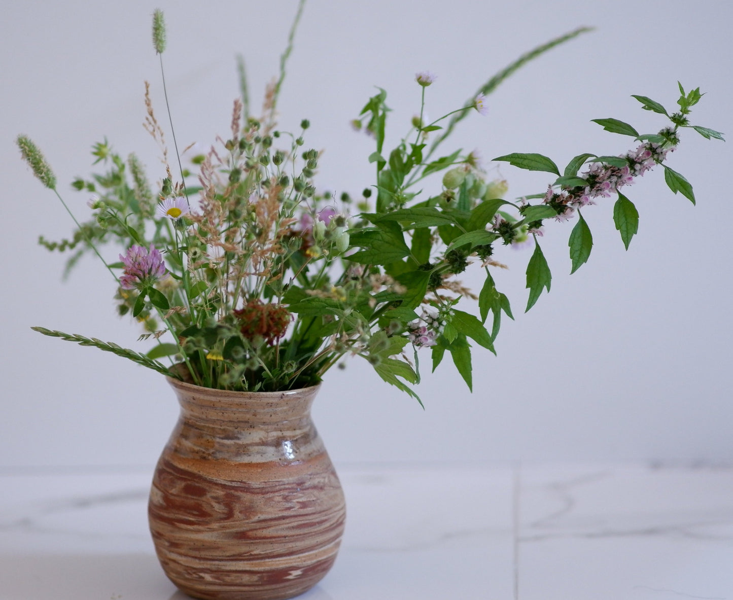 Ce vase est résistant à l'eau et peut contenir un petit bouquet (j'ai coupé les fleurs sauvages pour ces photos). Il est fait de terracotta mélangée à de l'argile blanche mouchetée.