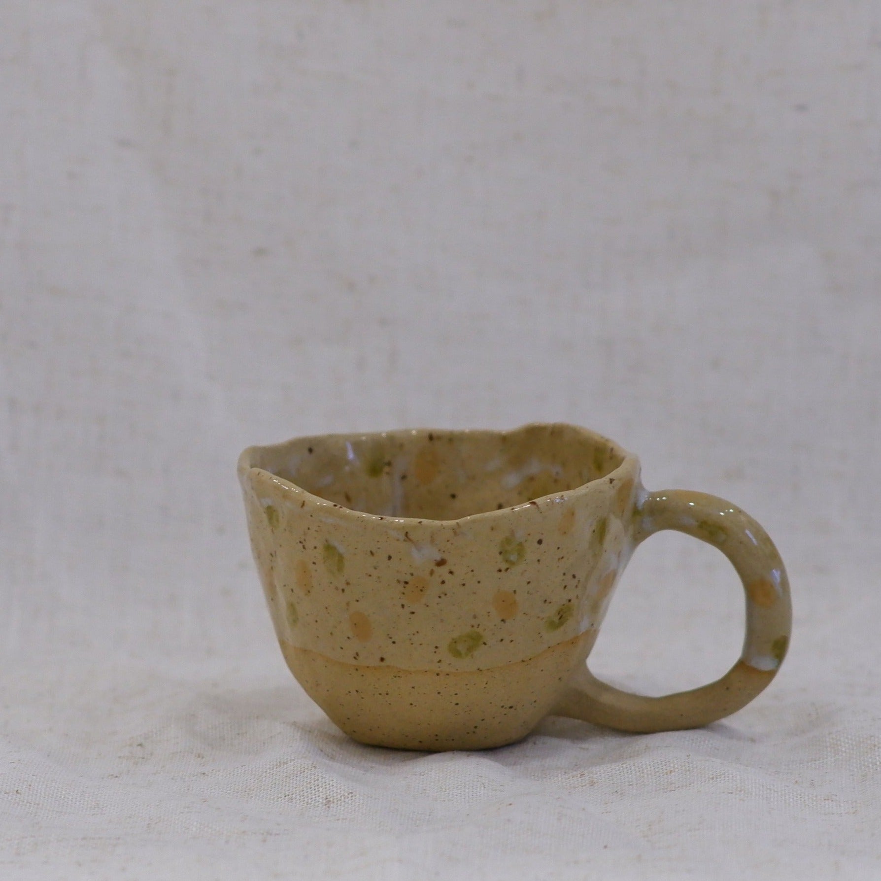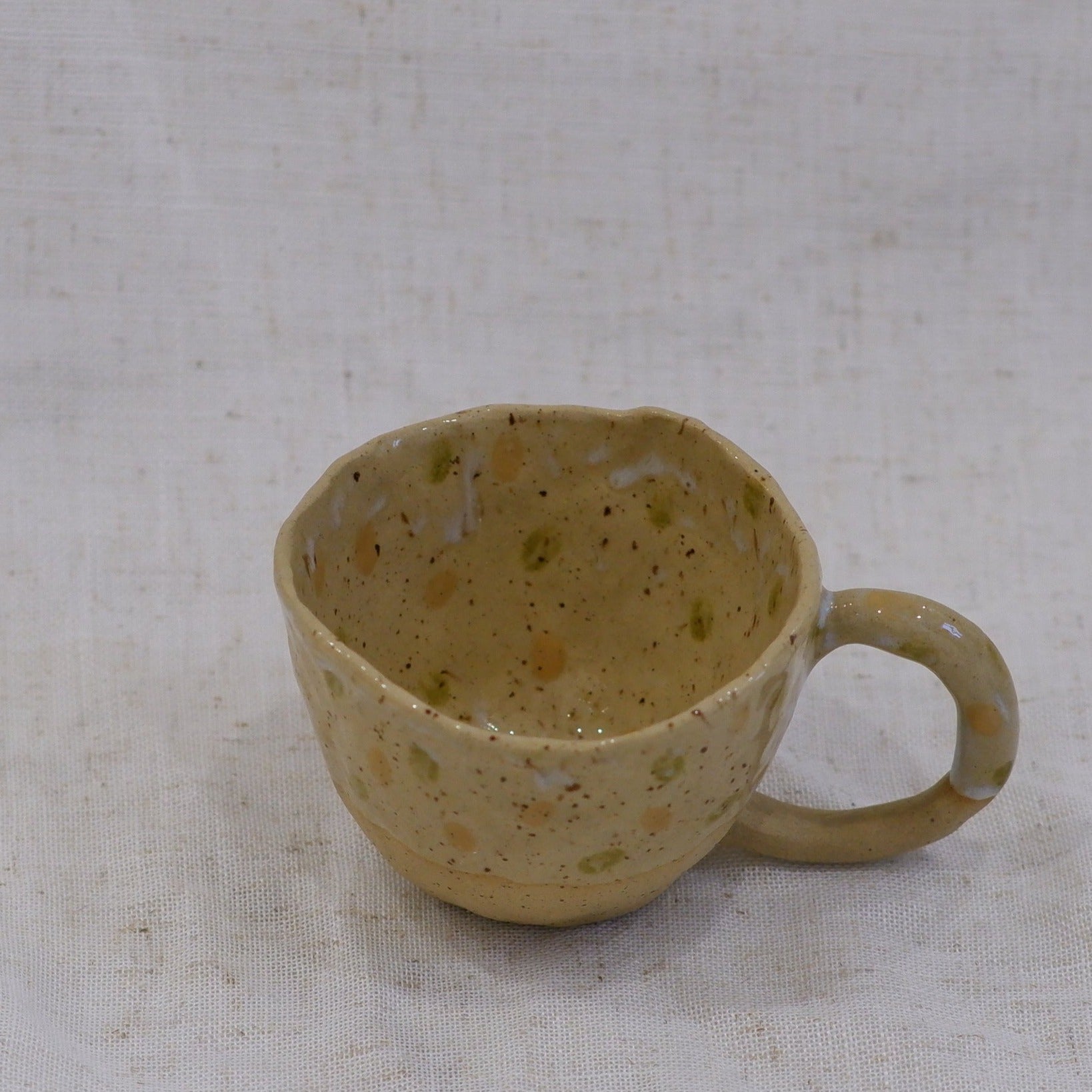 This mug in speckled clay is perfect for your morning coffee. It is 10cm (4in) wide, 7cm (about 3in) high, and is food, water, and dishwasher safe!