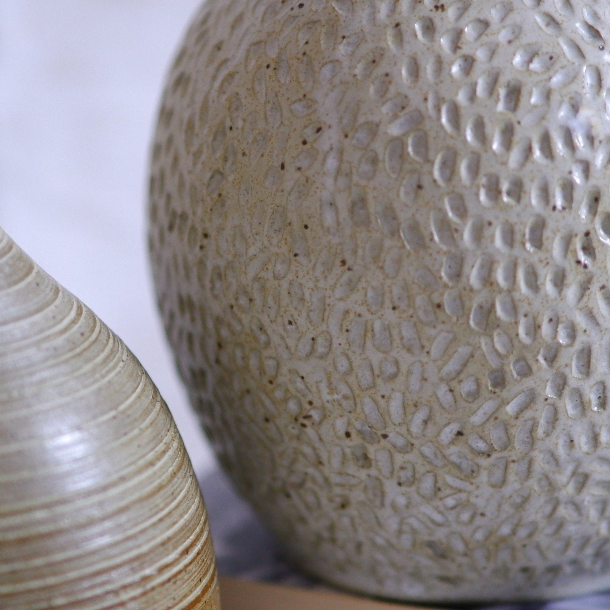 This vase has a ton of texture but remains muted thanks to the matte white glazing. It is in the shape of an egg, adding interest to any area. This vase is about 17cm (7in) high, 15cm (6in) wide at its widest, and the opening at the top is about 3cm (1in) wide. Since the piece is fully glazed, it is water safe.