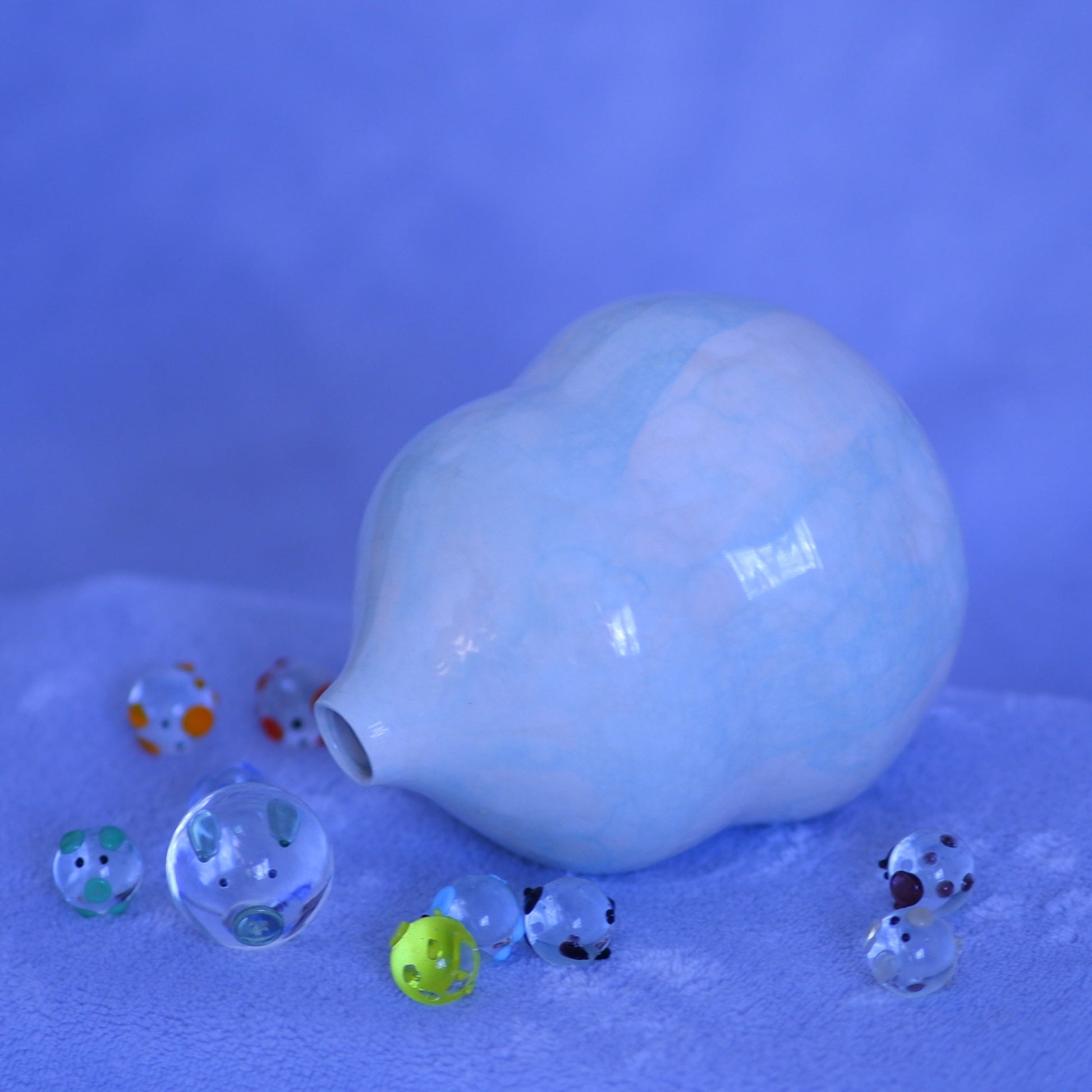 This porcelain vase glazed with blue bubbles is water safe. It's about 13cm (5in) high, 10cm (4in) wide at its widest, and the opening at the top is about 2cm (under 1in) wide.