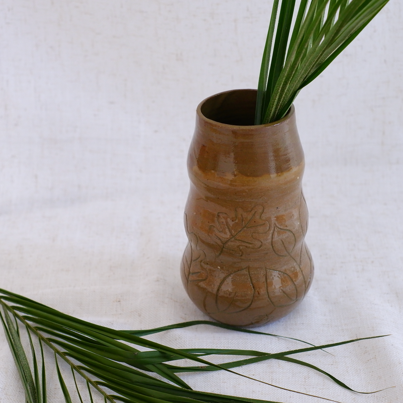 Hand-crafted on the potter's wheel, this vase boasts hand-carved foliage with intricate leaves and acorns. A charming addition to any home.