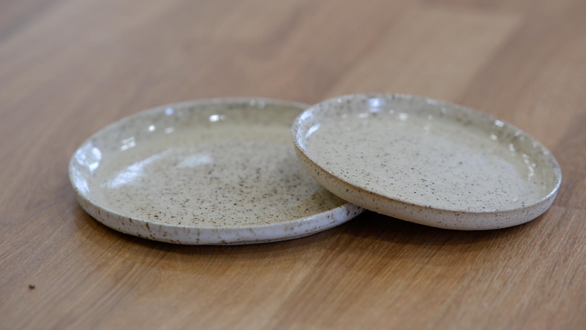 I have two plates, one small, one less small 😉 see dimensions below! The 'less small' plate has this beautiful halo where the clay was most compressed with less speckles.