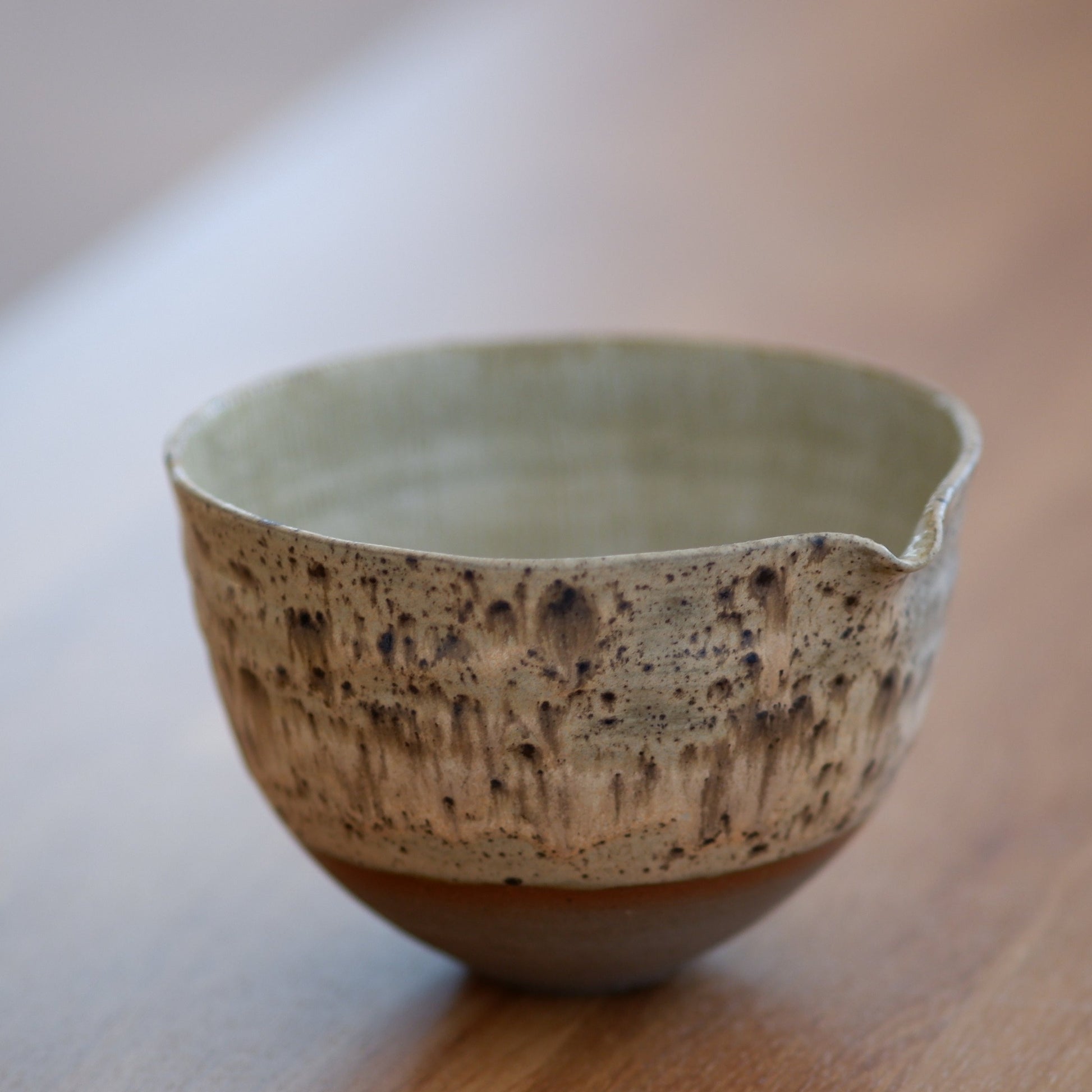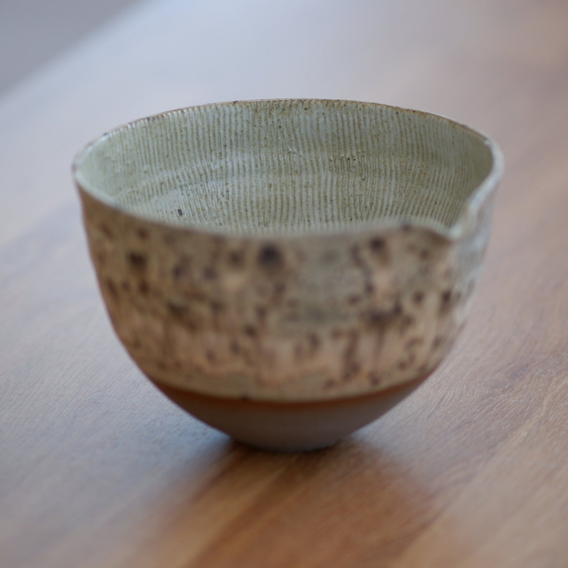 This textured bowl was made to grind sesame seeds with salt to make gomasio. Because of the thin walls and small base, I'm not sure how functional it'll end up being. It is food and dishwasher safe.