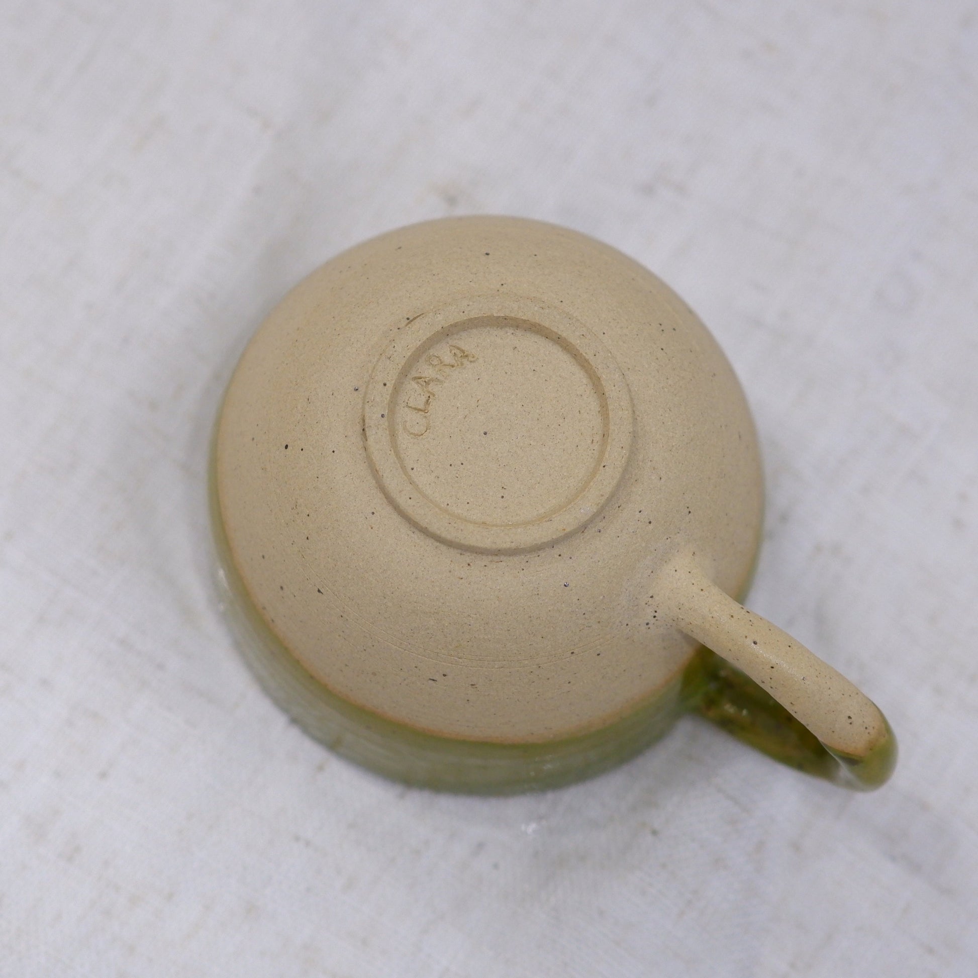 This mug in speckled clay is perfect for your morning coffee. It'll hold a latte to a big cup of black coffee. It is 10cm (4in) wide, 7.5cm (about 3in) high, and is food, water, and dishwasher safe!