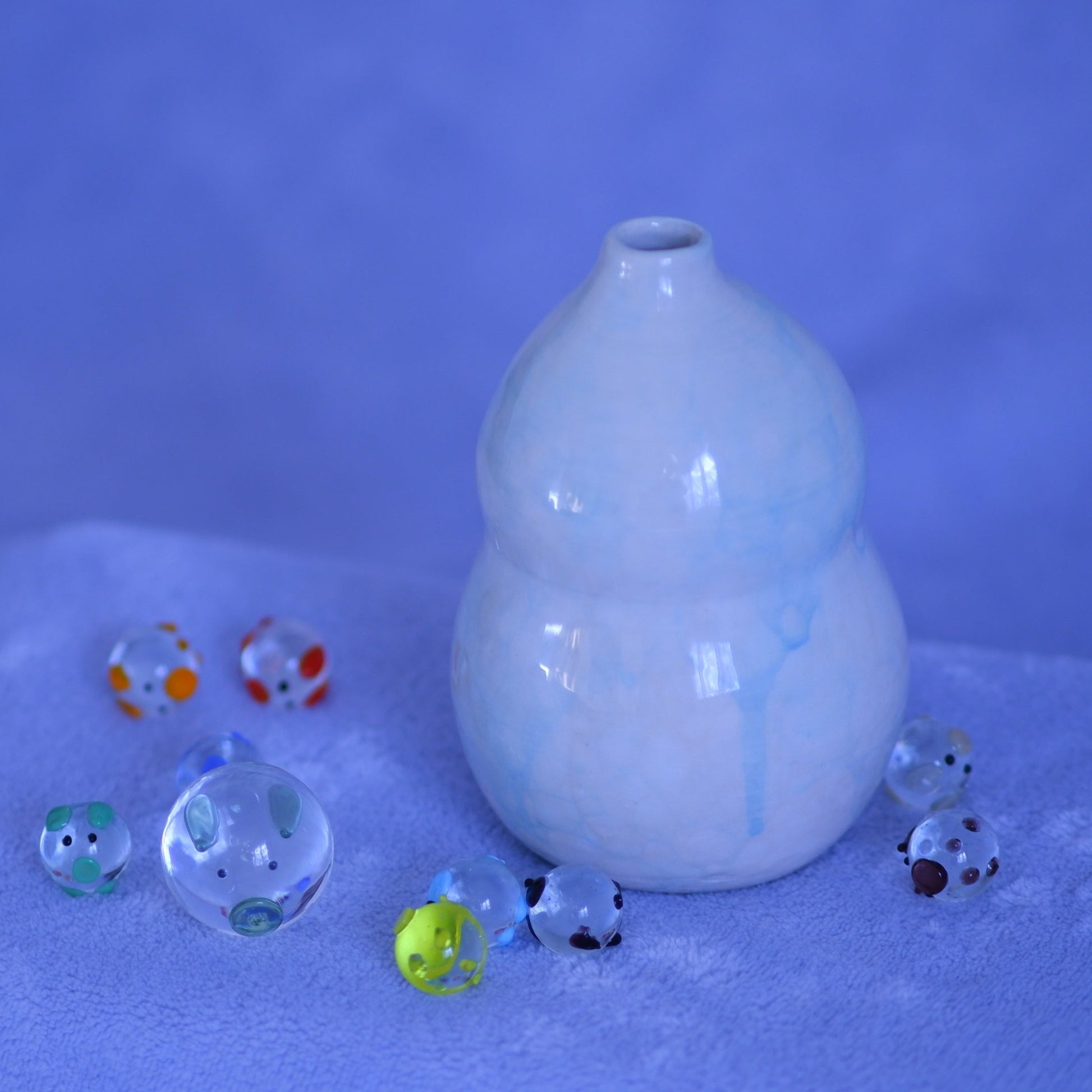 This porcelain vase glazed with blue bubbles is water safe. It's about 12cm (5in) high, 8cm (3in) wide at its widest, and the opening at the top is about 2cm (under 1in) wide.