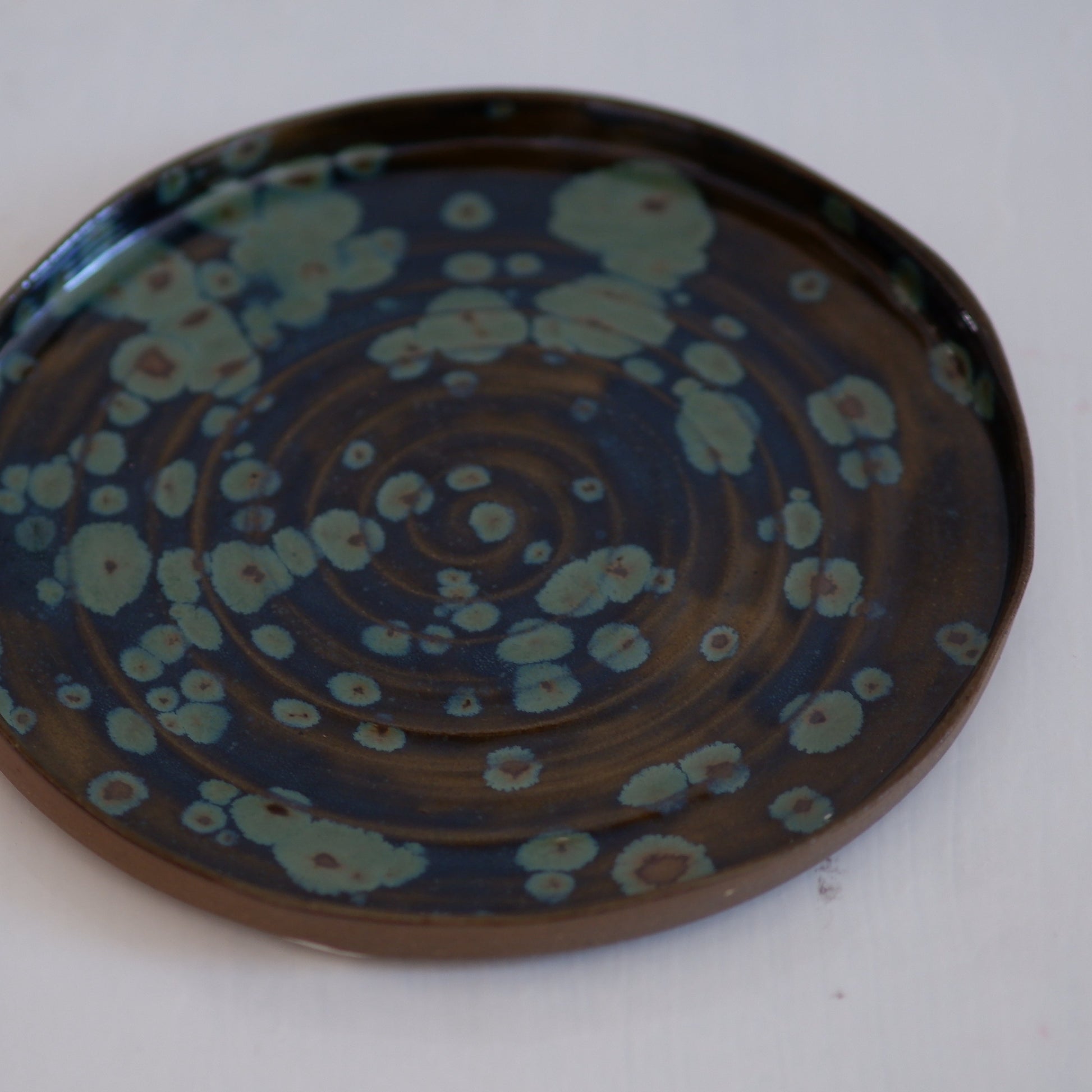 This is my first ever plate large enough to actually qualify as a dinner plate! I added a swirl inside for some texture, and the olive, turquoise, dark blue and brown glaze adds its own dimension. The plate is about 7.5in (19cm) wide. It is food and dishwasher safe.