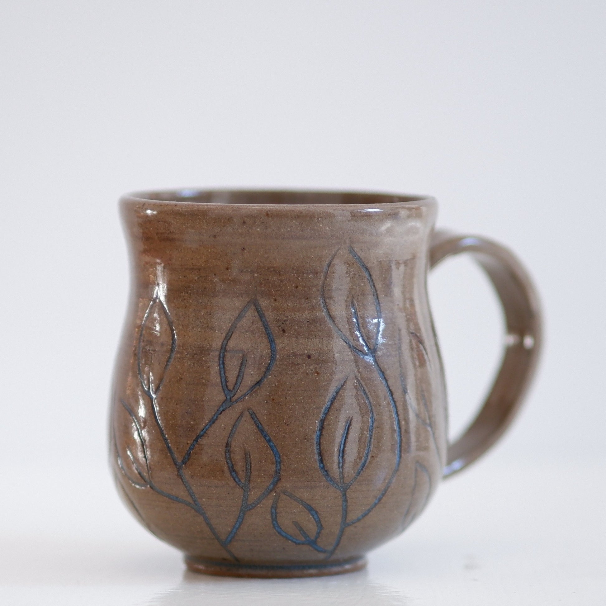 I love me a good leaf design, though I rarely take the time to carve my pieces these days... If you like them too, more will come! The mug is food and dishwasher safe. It is about 3.5in (9cm) high and 3in (7.5cm) wide.